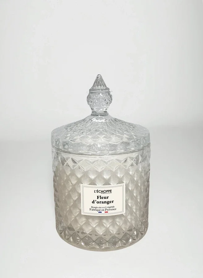 BONBONNIÈRE DIAMANT Bougie parfumée cire 100 % végétale soja Mèche en coton Durée de combustion 50 h Poids Net : 200g Parfum de Grasse Fabriqué en France