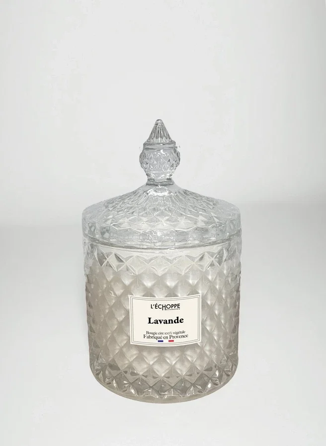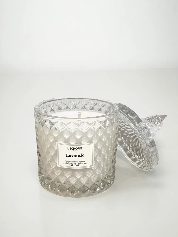 BONBONNIÈRE DIAMANT Bougie parfumée cire 100 % végétale soja Mèche en coton Durée de combustion 50 h Poids Net : 200g Parfum de Grasse Fabriqué en France