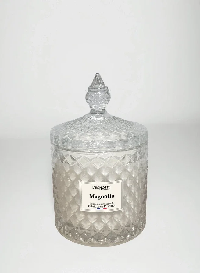 BONBONNIÈRE DIAMANT Bougie parfumée cire 100 % végétale soja Mèche en coton Durée de combustion 50 h Poids Net : 200g Parfum de Grasse Fabriqué en France
