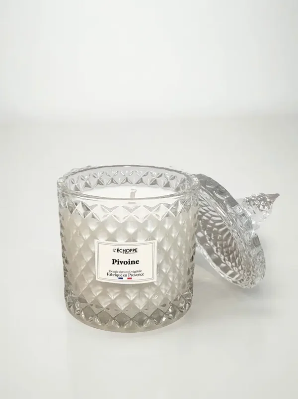 BONBONNIÈRE DÔME Bougie parfumée cire 100 % végétale soja Mèche en coton Durée de combustion 50 h Poids Net : 180g Parfum de Grasse Fabriqué en France